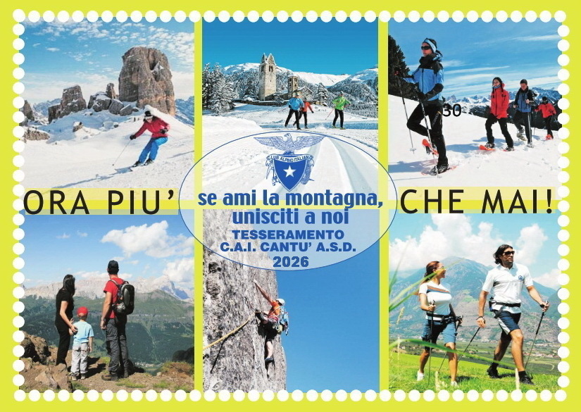 Per i rinnovi del tesseramento basta inviare una mail a segreteria@caicantu.it con i nominativi da rinnovare e la conferma di pagamento via bonifico all' Iban = IT 75 J 08430 51060 000000042302 - intestato CAI Cantù ASD o Satispay, cercando "c.a.i. cantù a.s.d." , così noi procederemo all'inserimento e ad inviarvi la scheda di attestazione. Poi potrete passare a ritirare il bollino.