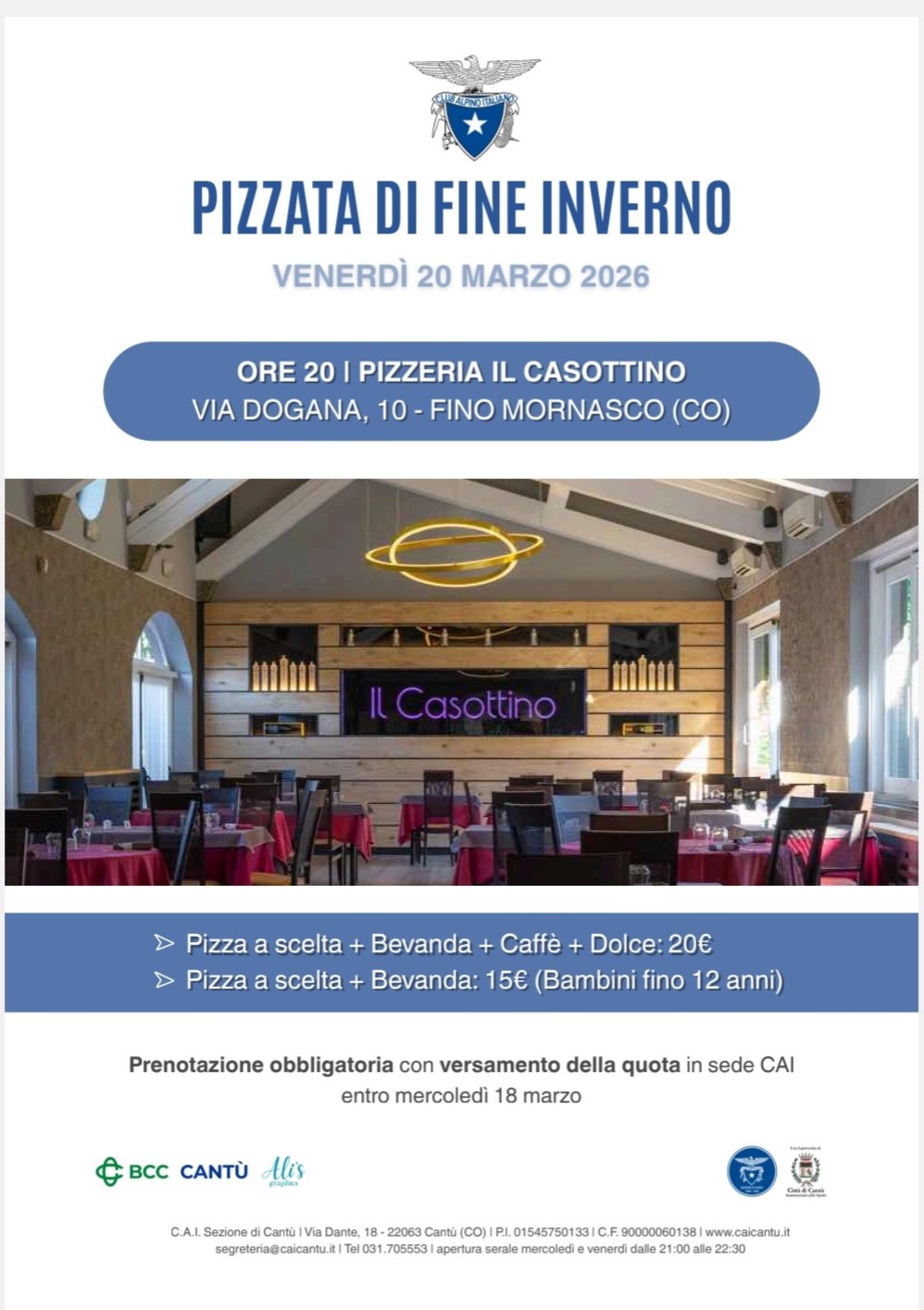 Chi fosse interessato a partecipare o a ricevere informazioni può rivolgersi alla sede del CAI Cantù durante gli orari di apertura, oppure seguire le comunicazioni sui canali ufficiali della sezione.